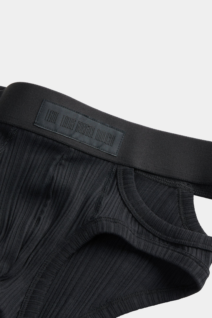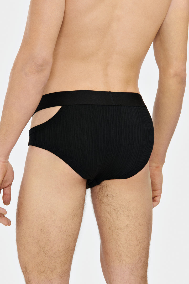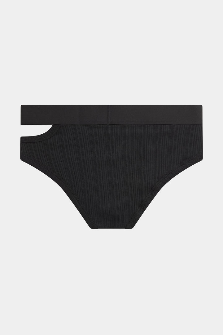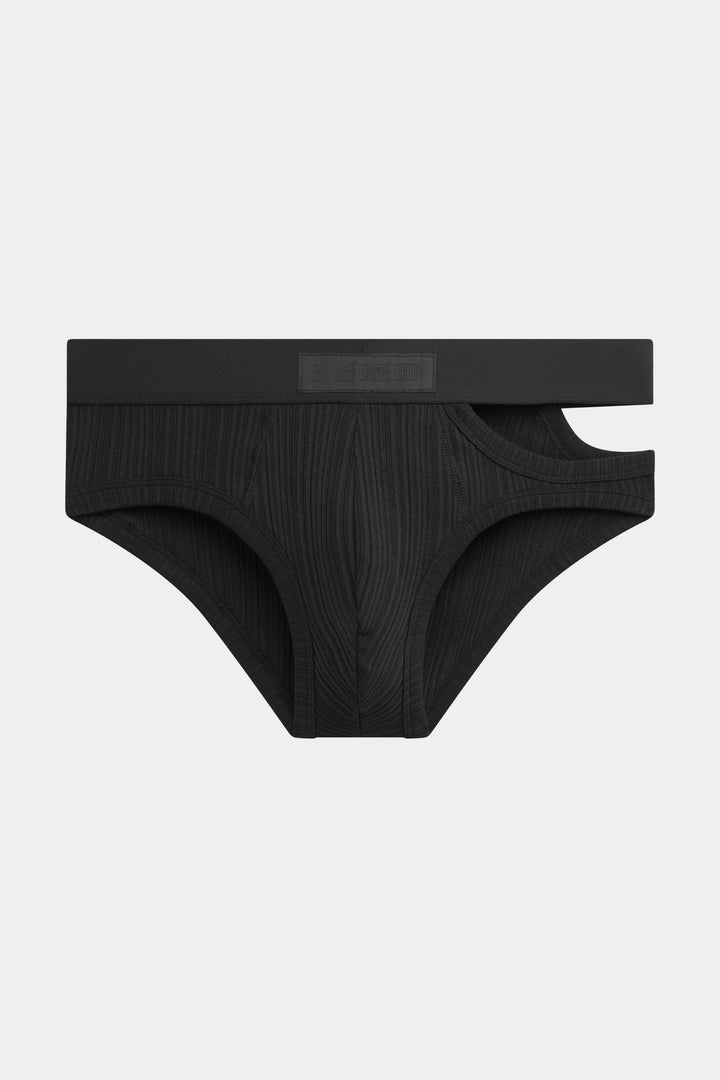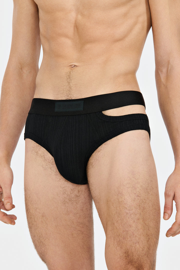 Brief with asymmetrical opening on the left side, in jersey irregular ribs.