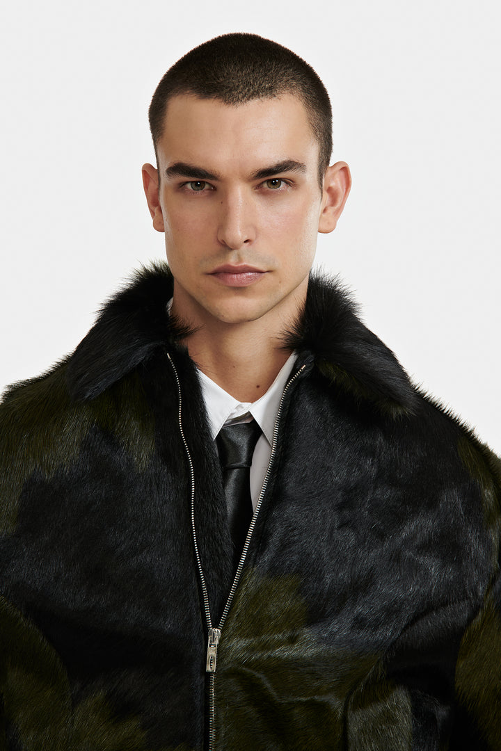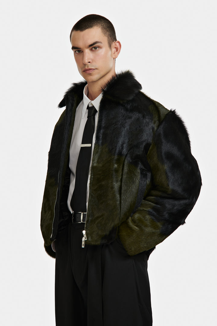 Blouson paddé en cuir à poils court 100% naturelle dôté de manches semi-raglan et de découpes arrondies.
