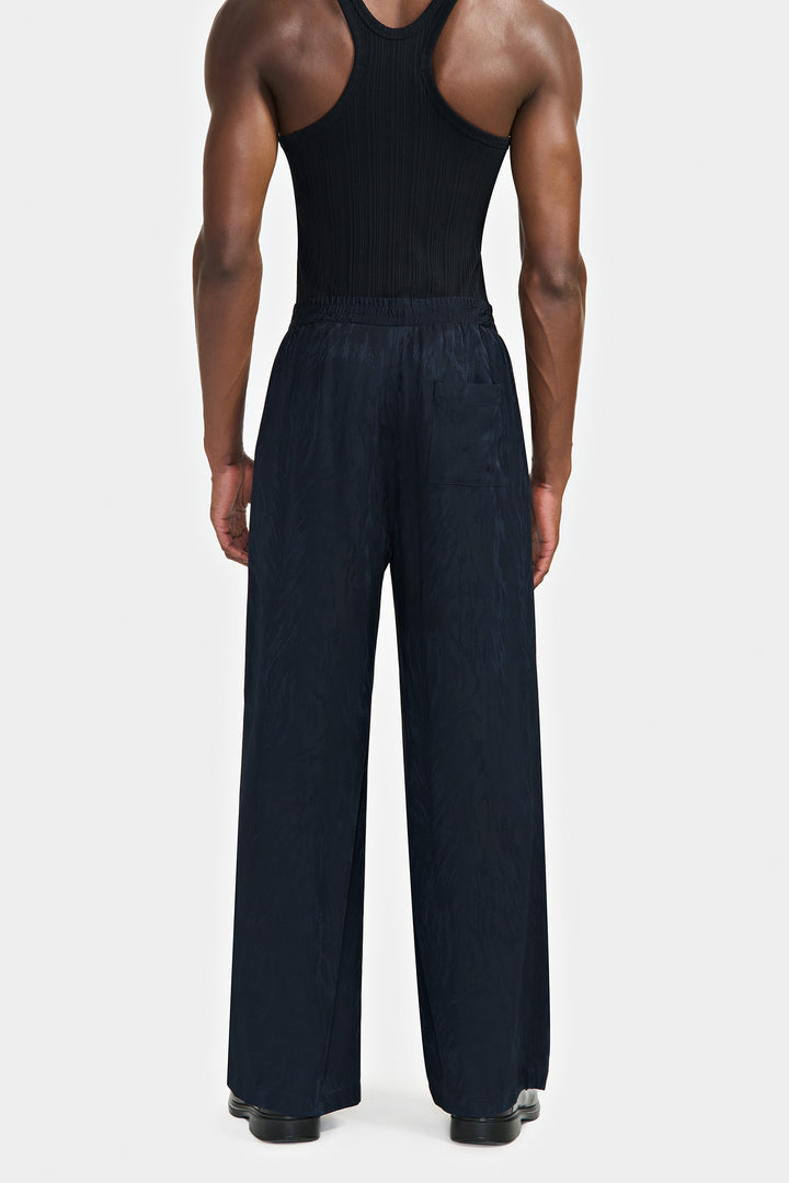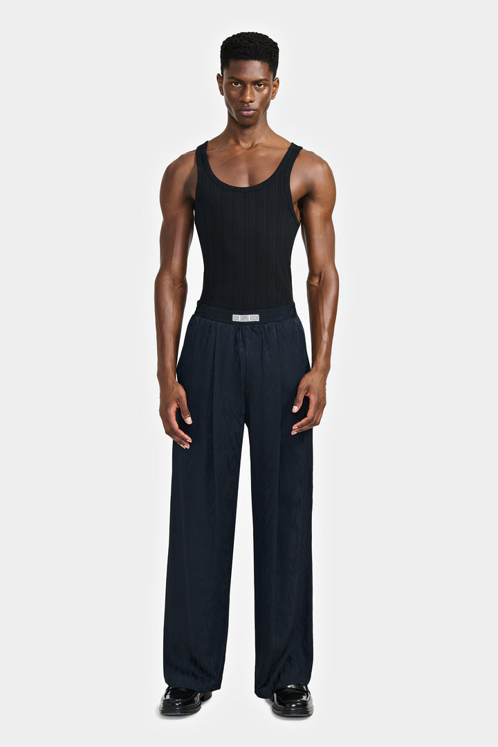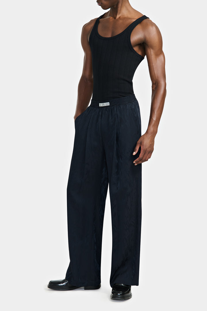 Pantalon large style pyjama avec ceinture élastiquée en jacquard de viscose. Le motif fourrure est représenté en brillance sur un fond mat.