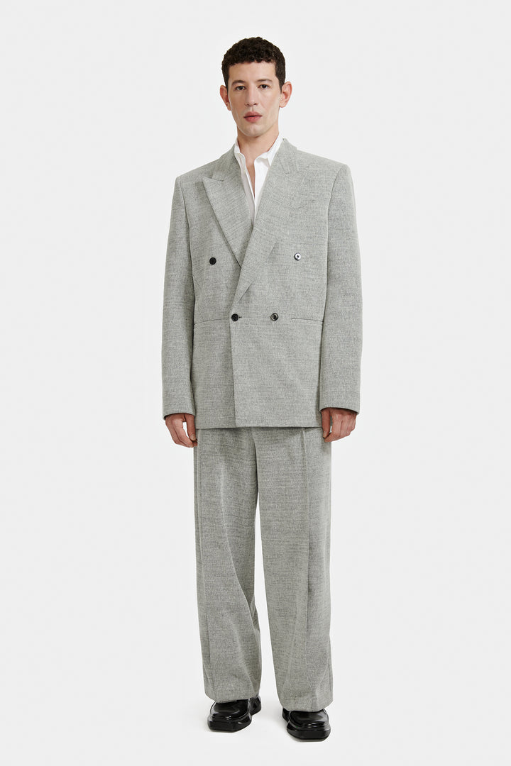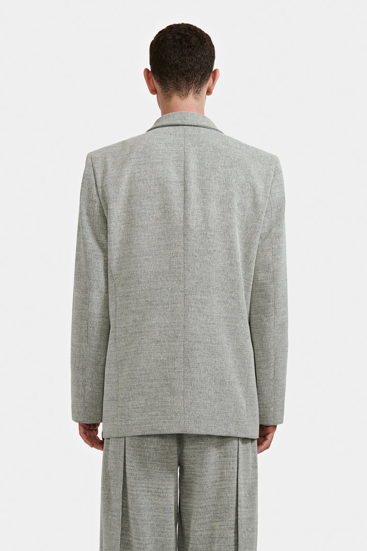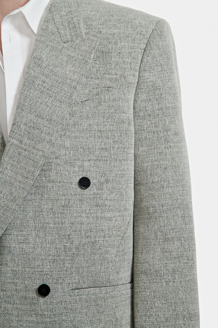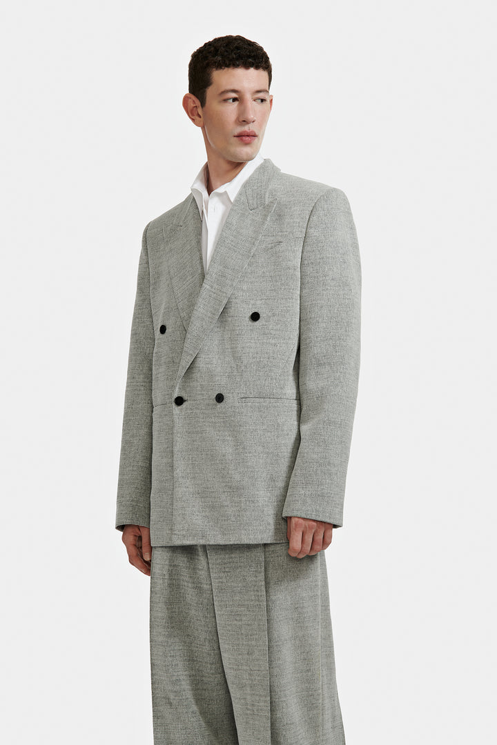 Veste double croisure à quatre boutons confectionnée en tissu moucheté.