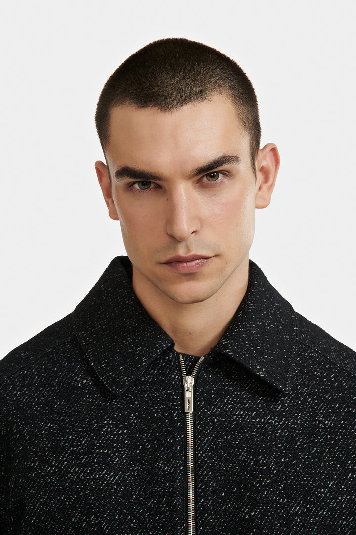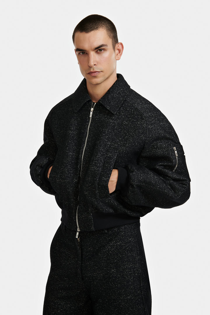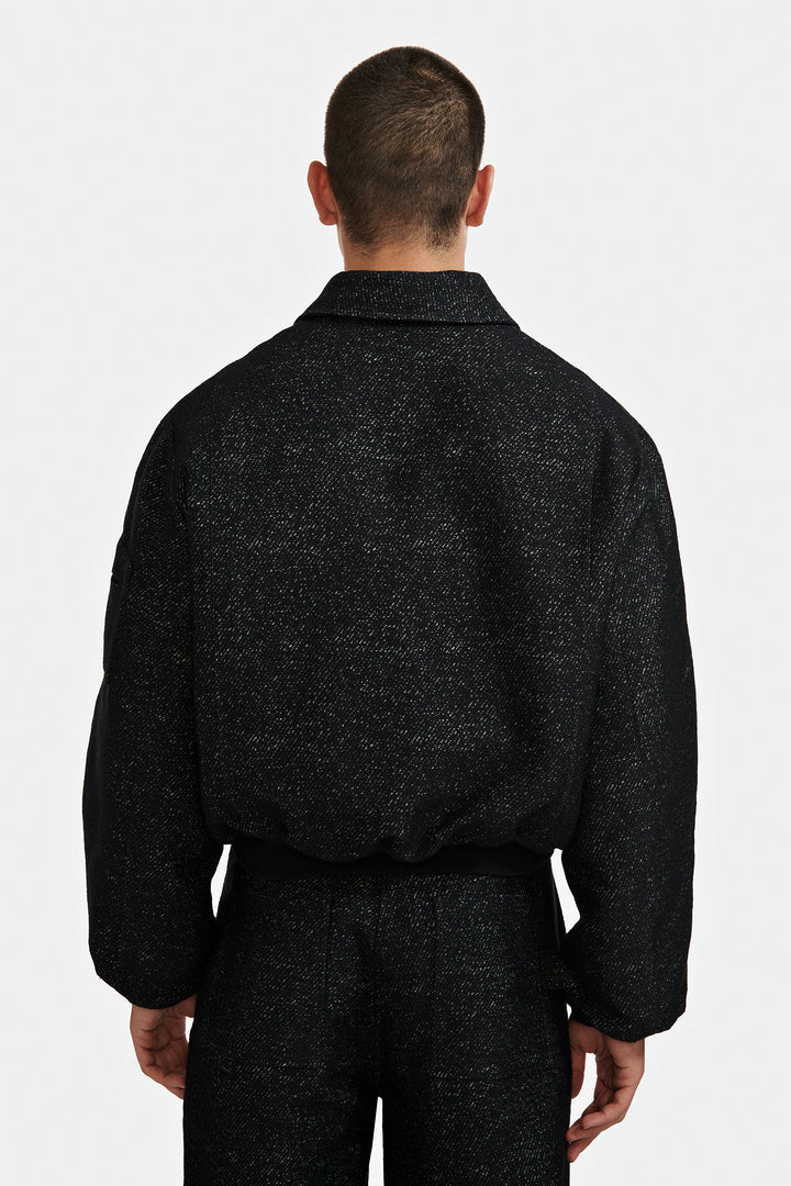 Veste bombers en drill moucheté, matelassée et courte. Sa coupe généreuse est structurée par des manches semi-raglan et met en avant la taille.