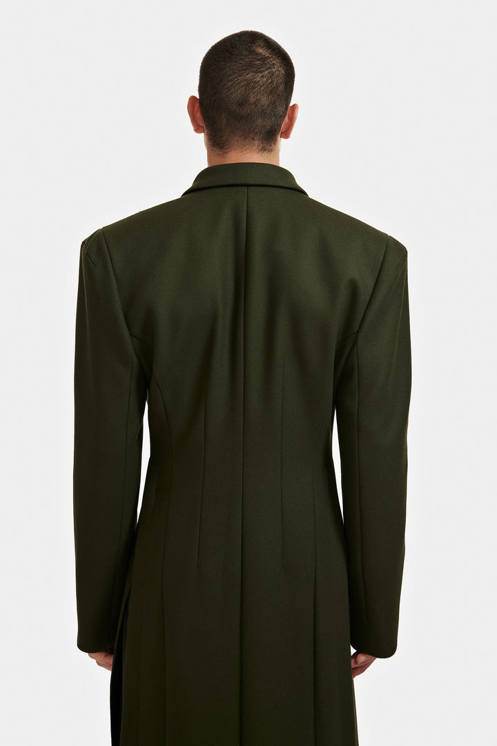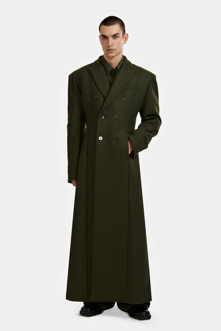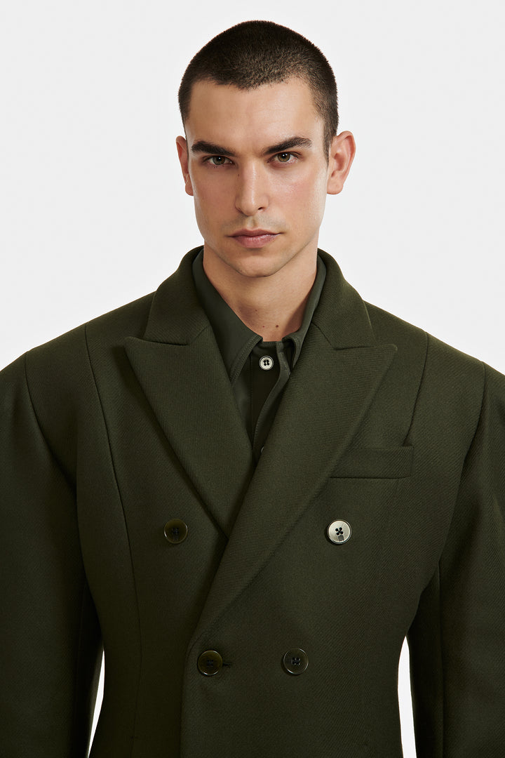 Manteau double croisure à six boutons et épaule large confectionné en laine.