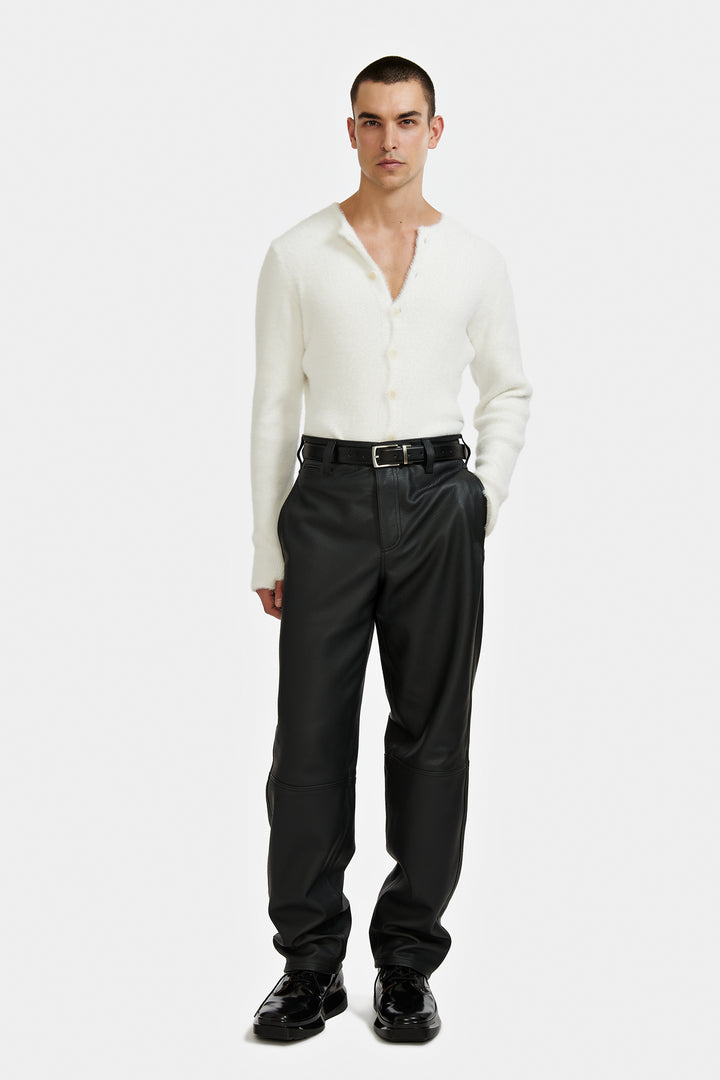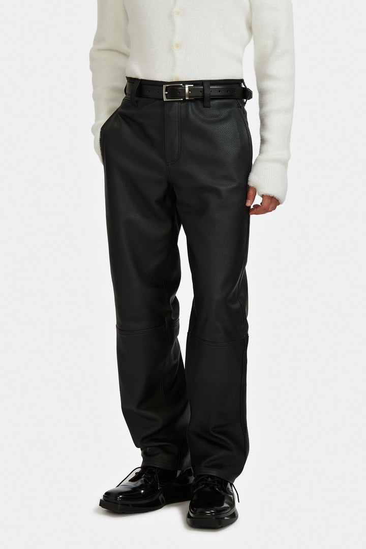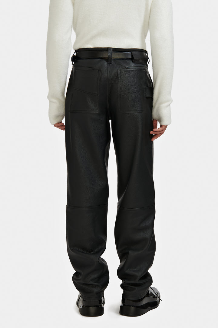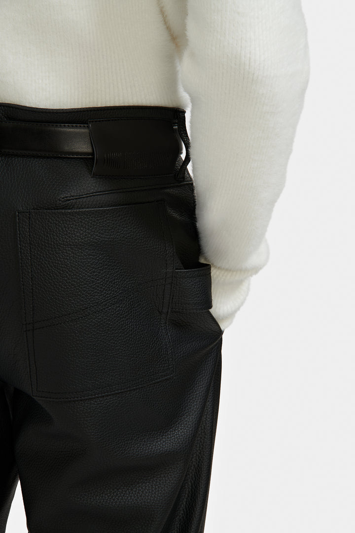 Pantalon droit en cuir. La coupe épouse les jambes et se porte taille mi-haute, pour mettre en valeur les hanches et apporter un look élancé.